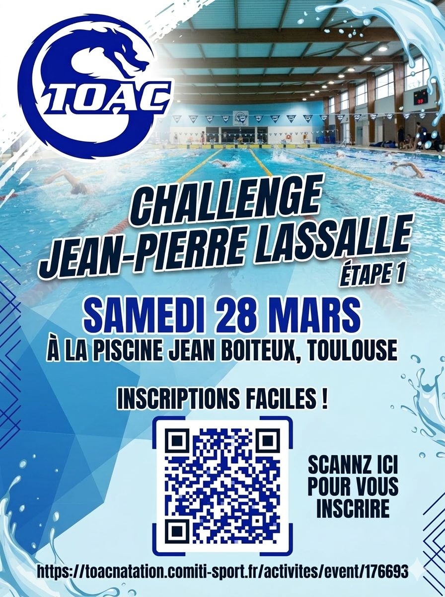 Le challenge se déroulera sur l'intégralité de la matinée le samedi 28 Mars sur la piscine Jean Boiteux (8h45-11h45)